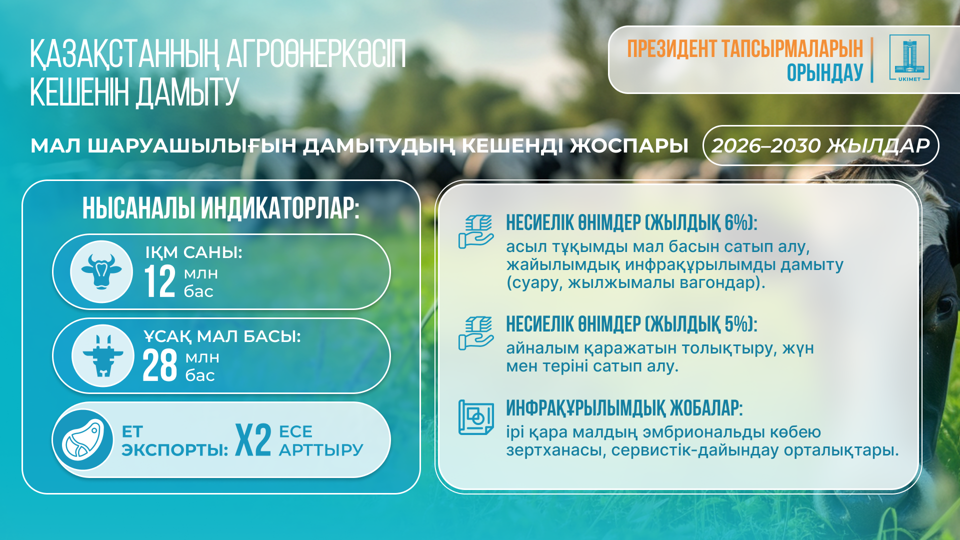 Мұндай терең модернизация оны тұрақты, өнімді әрі бәсекеге қабілетті ету үшін бүкіл аграрлық секторды жүйелі түрде жаңартуды көздейді. Үкімет бұл бағытпен тығыз байланыста Мал шаруашылығын дамытудың 2026-2030 жылдарға арналған кешенді жоспарын мақұлдады. Ол мал басын арттыруға ғана емес, өнімділікті ұлғайтуға, сондай-ақ саланың экспорттық мүмкіндіктерін едәуір кеңейтуге мүмкіндік беретін сапалы өңдеуді жақсартуға бағытталған.